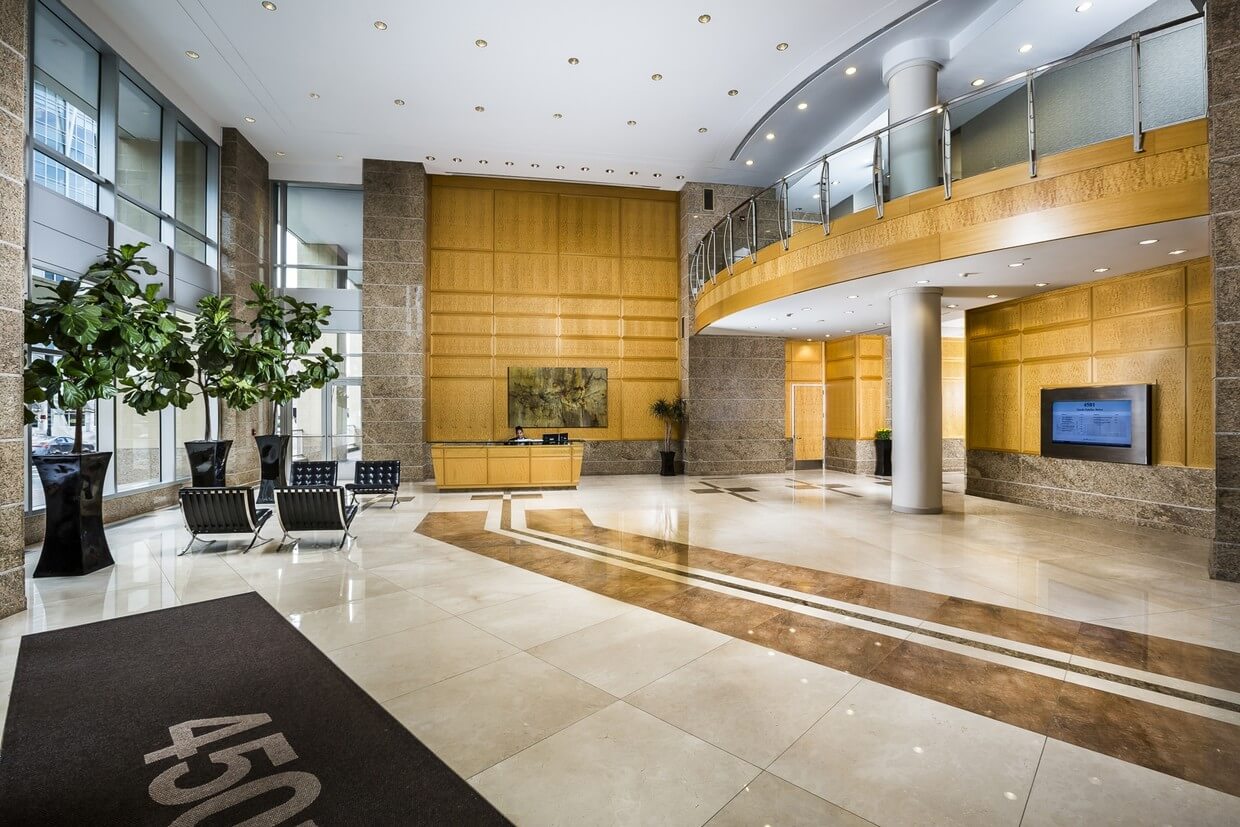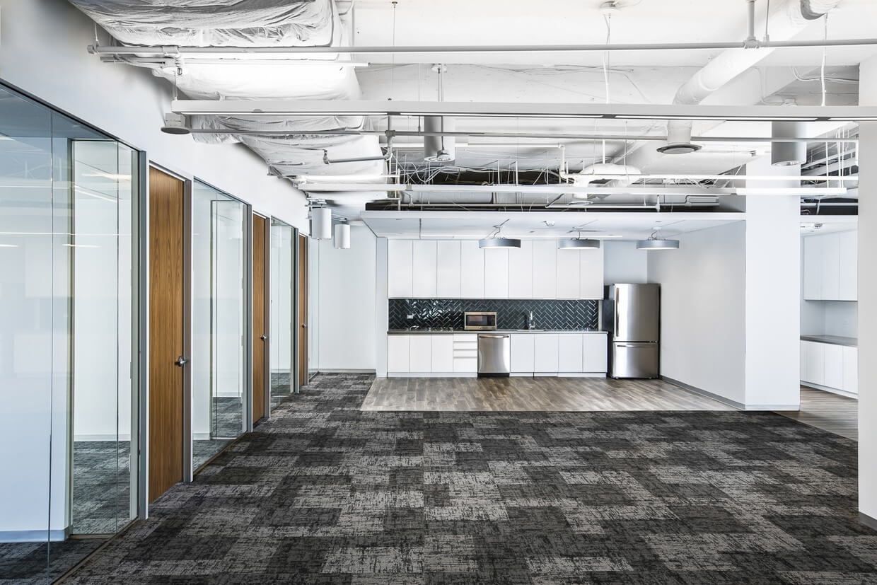 Both suites are located on the corner of the building, allowing for an abundance of natural light to flood through the floor-to-ceiling glass curtain walls. The windowed offices with solid wood doors still allow maximum light to travel through to the interior of the space with their full height glass walls.