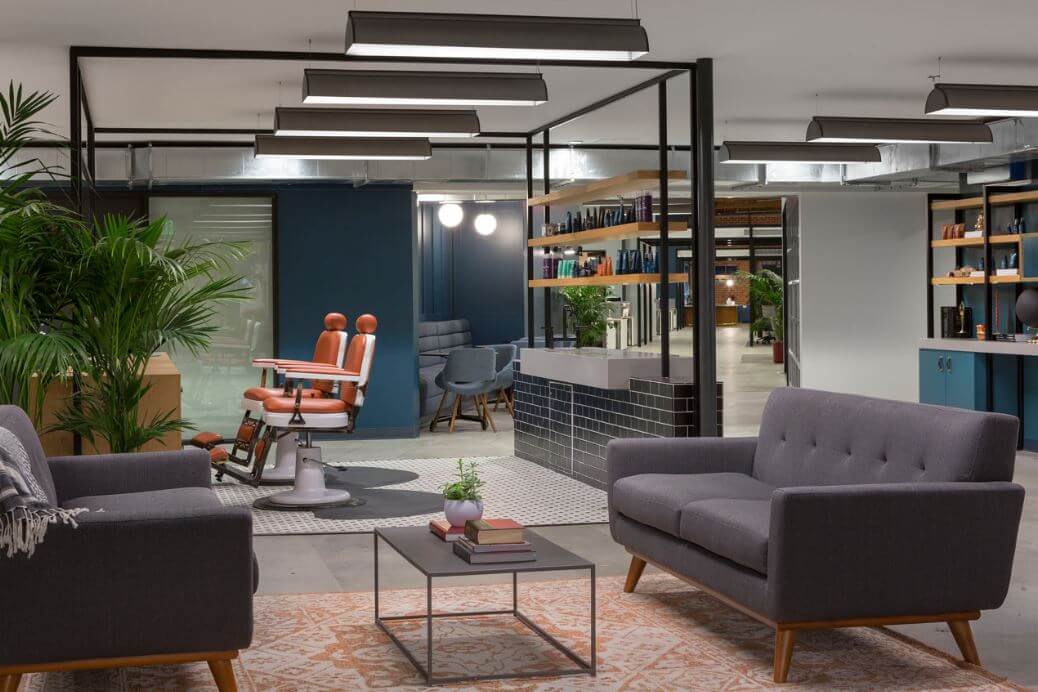 After quickly outgrowing their previous space in Marina del Rey, Dollar Shave Club needed to double their size and find a new home. They previously occupied 26,000 SF of space and doubled into a new 50,000 SF space right next door. They engaged the help of Rapt Studio to design the entire space. The former warehouse was completely gutted and revamped with a massive open floor plan consisting of communal work space, breakout meeting rooms, a massage and relaxation room, a barber shop(!!!), a coffee bar with barista, showers, bike stations and a myriad of other desirable perks for this incredible work space.