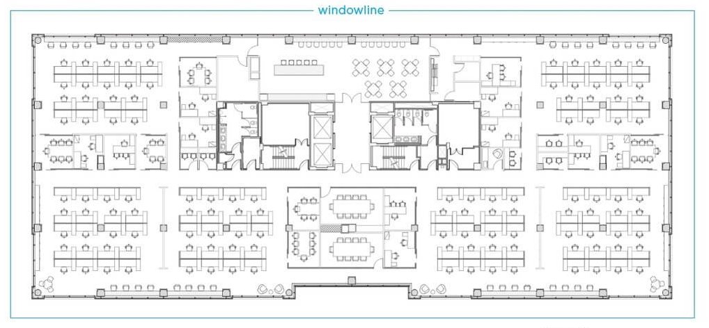 As one might imagine, this space was designed to fit a high headcount but allows for pockets of private space for everyone to use. How high of a headcount? The floor was designed to accommodate nearly 160 seats plus conferencing and huddle rooms. At 118 SF per person, this plan is a true example of efficiency paired with collaboration.