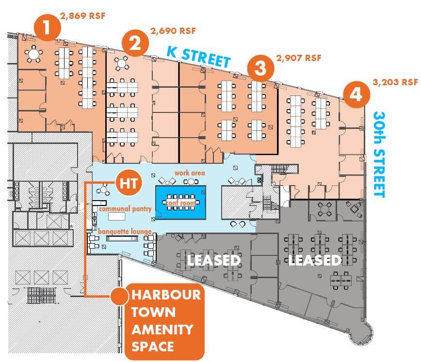 The building offers underground parking, dedicated shuttle service to Foggy Bottom and Dupont Circle Metro stations, and is only a short commute across the Potomac to Rosslyn. Each suite has an asking rent ranging from $49.00 – $55.00/SF, though all communal space is shared on a pro rata basis. While two of the six suites have already been leased, four suites ranging from 2,690 SF to 3,203 SF remain available for the next firm that wants to explore MRP’s new concept. If you’re interested in Harbour Town or other spaces like it, feel free to contact us here.