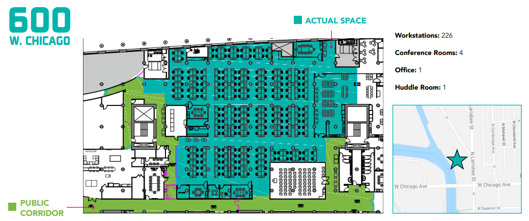 Perfect for a tenant looking to join Groupon HQ (not to mention the Big Ten Network, Wrigley, Dyson, and Lightbank) in an ideal location, this high-visibility sublease on the 3rd floor allows for 226 workstations, 4 conference rooms, one office, and one huddle room. The hip modern space features exposed ceilings and an open floor plan, with plenty of room to spread out and accommodate diverse work styles.