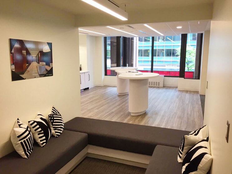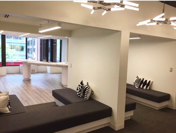 The most notable feature within the suite is the open kitchen that is thoughtfully designed to double as a collaborative area. Located in the middle of the suite along the window line, the kitchen naturally draws in employees, which can be a major factor for companies looking to build culture and teamwork. The kitchen is bordered by two nooks with comfortable booth seating that can be used as a quiet space to work or an area for impromptu meetings.