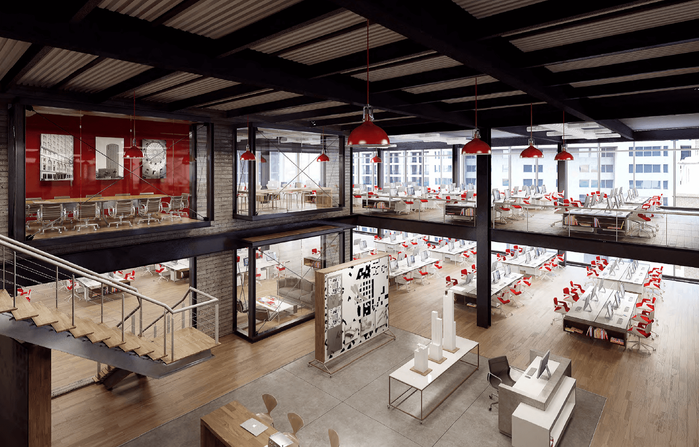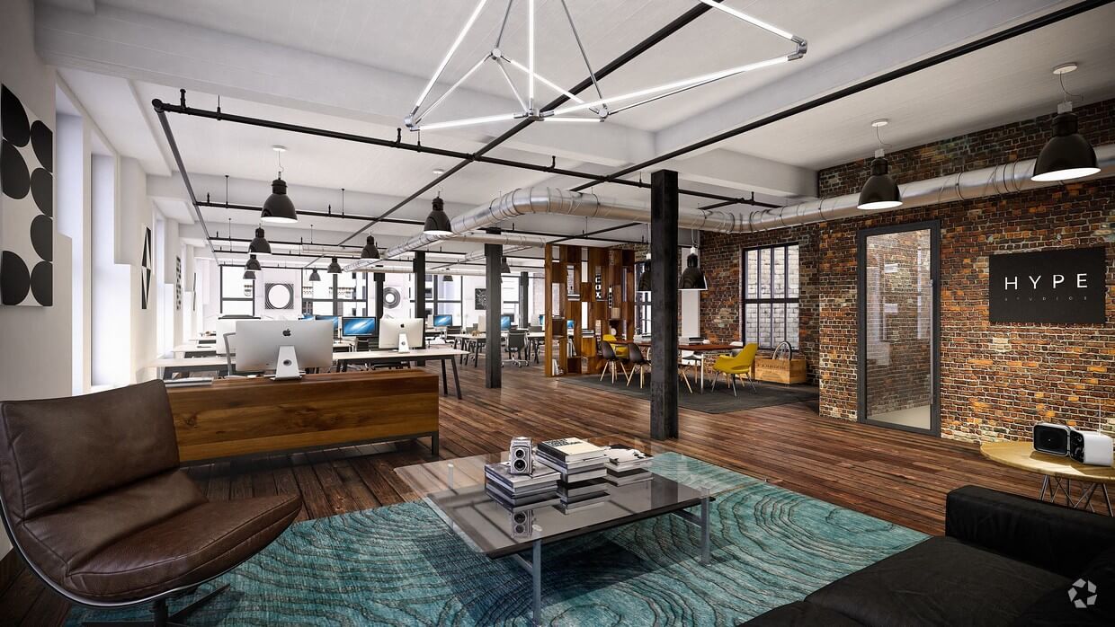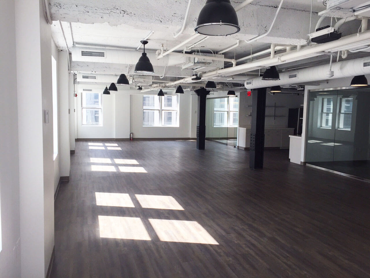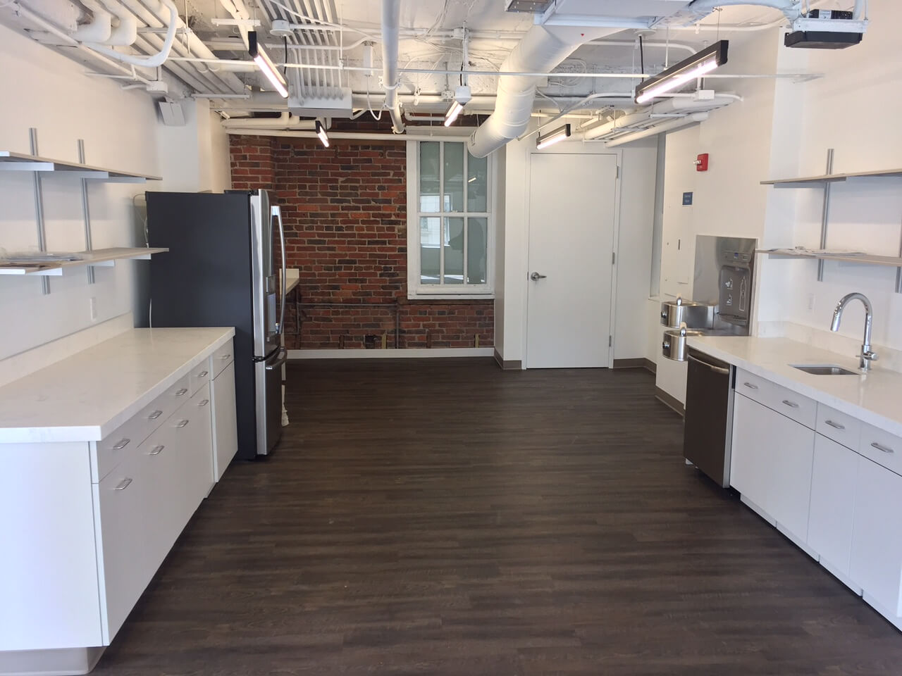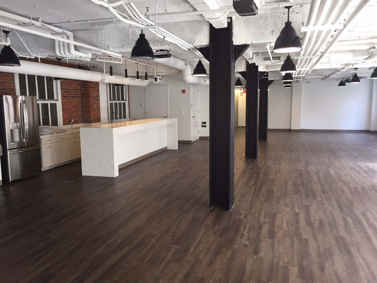 “The concept was to emphasize a contemporary industrial look by exposing many of the historic elements of the 100+ year old building that are so special. We removed the drywall along the interior walls to expose the original brick, stripped the columns to reveal the original steel structure and installed simple black pendent light fixtures to accentuate the open ceiling.”