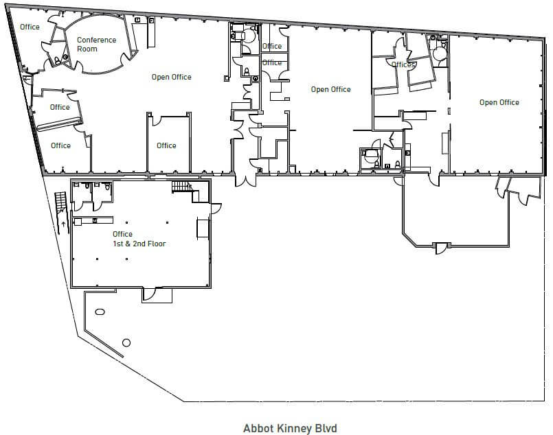 The layout is situated as such that it has a handful of private offices surrounding a good amount of open space. There is also a 2nd story mezzanine on top of the ground floor where the restrooms are located as well as scattered workstations. There are a few outdoor private breakout areas to lounge as well as a private patio.