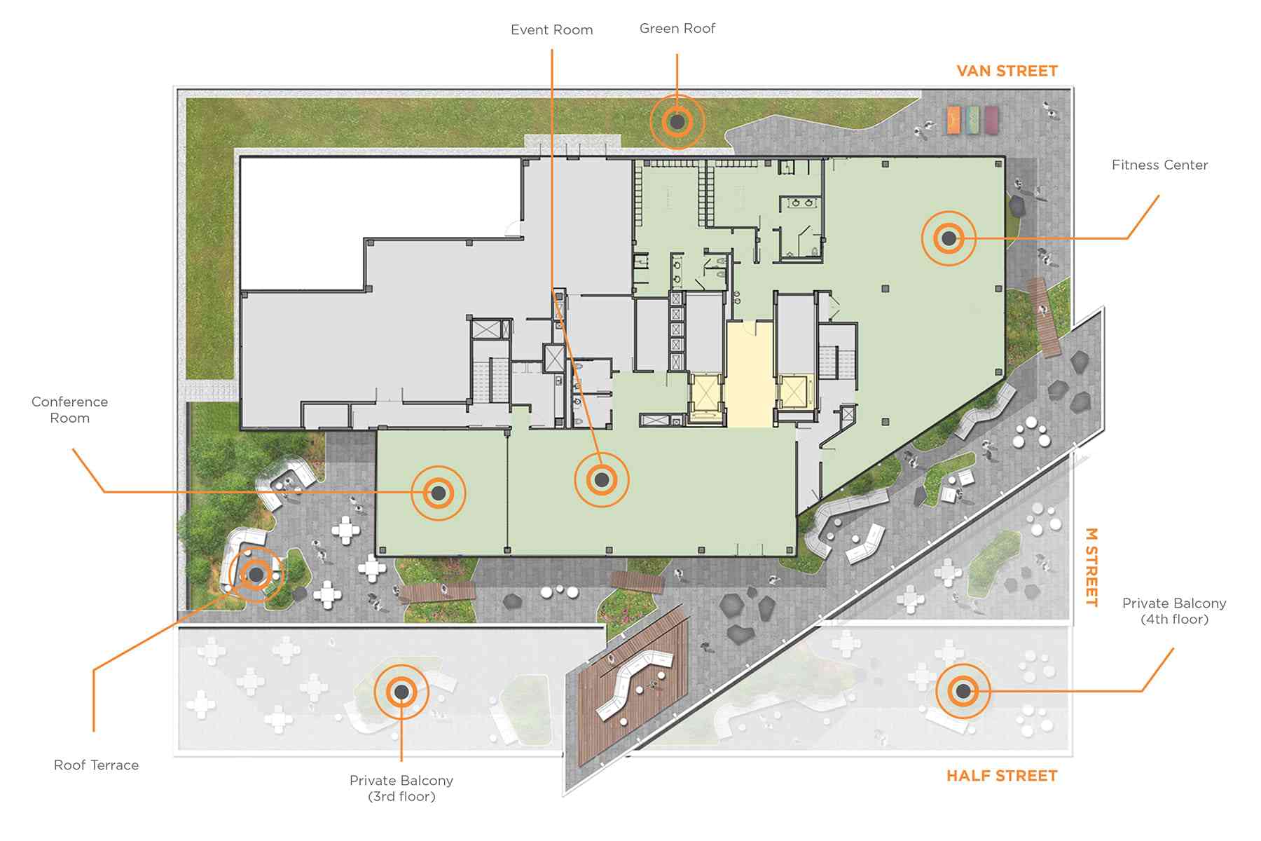Currently home to the Bullpen along Half Street, the surface lot will soon be developed into a stunning new office building perfect for creative users. Rather than delivering a vanilla glass box commonly seen throughout the CBD, the project’s architect, HOK, has designed an office building reflective of the neighborhood’s progressive transformation.