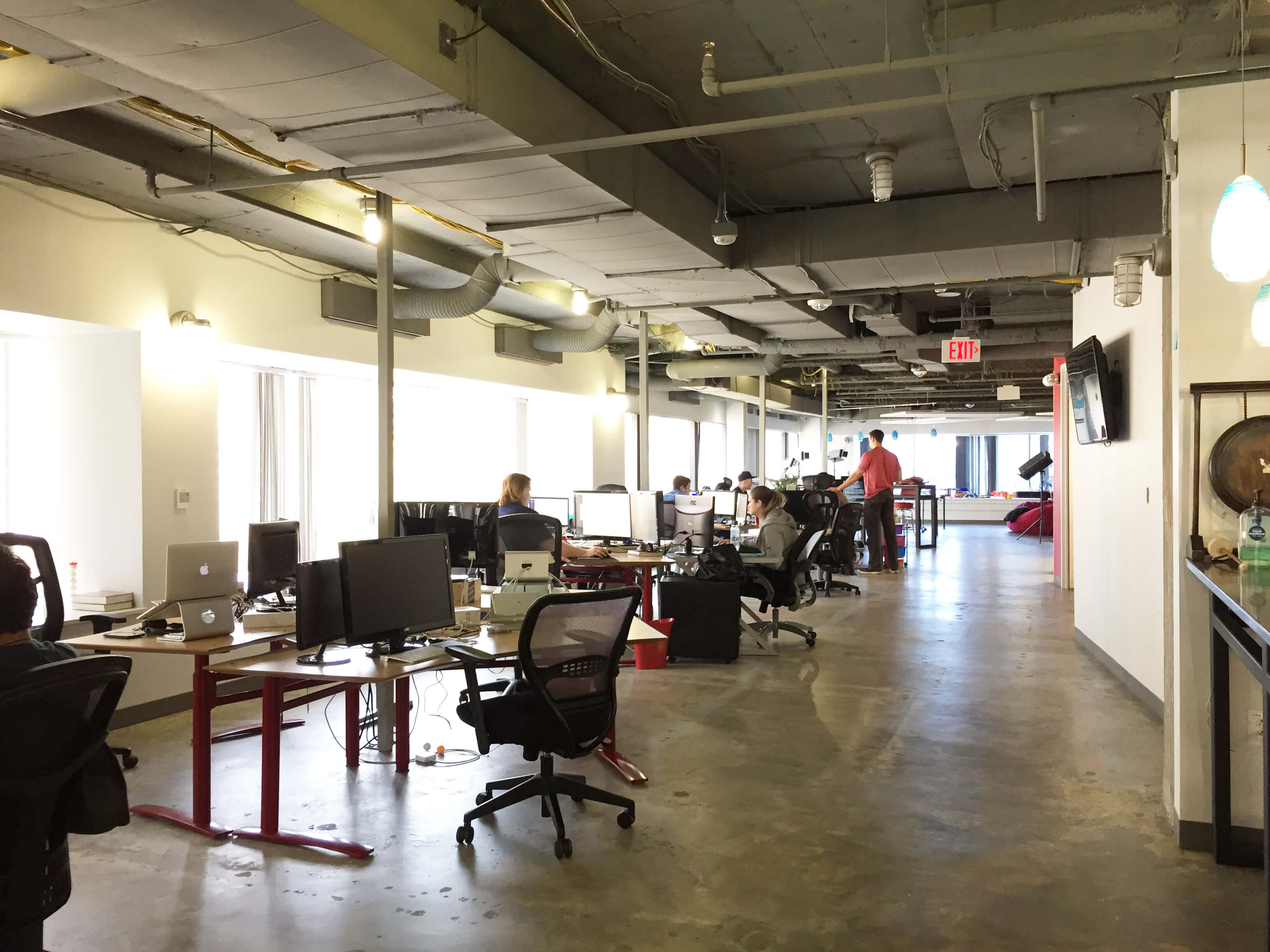 The almost completely open suite is has three sides of glass, with great natural light and views of Franklin Square Park. The 8th floor suite is ideal for 25-35 employees and includes 27 workstations, 3 private offices, a large conference room with garage door, a wall-mounted bike rack, a kitchen that doubles as a collaborative gathering area, and a game room with the almighty ping pong table. The exposed ceiling and polished concrete floors provide the finishing touches that make the suite really stand out. Click here for floor plan.